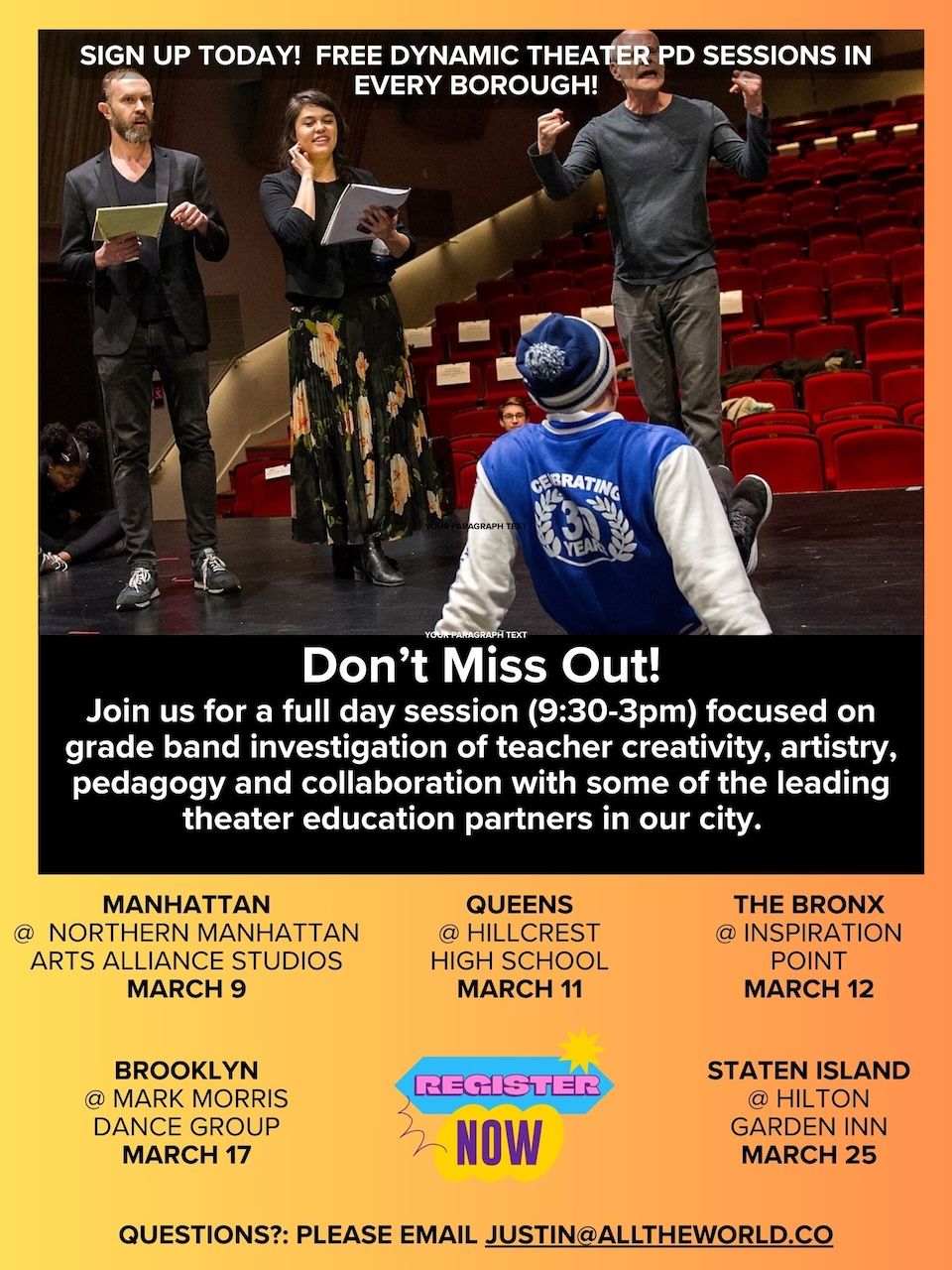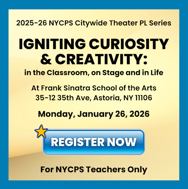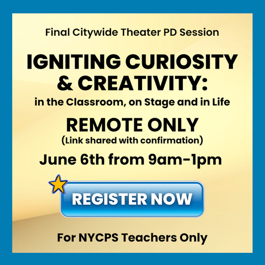 WELCOME to i Teach Theater, our "one-stop" site of ongoing theater professional learning and resources for all new and veteran theater educators across NYC public schools. This is your DOE theater education home base! Thank you for your powerful commitment to access and equity for a dedicated theater education for all our NYC youth and their communities. Click below to start your own learning!